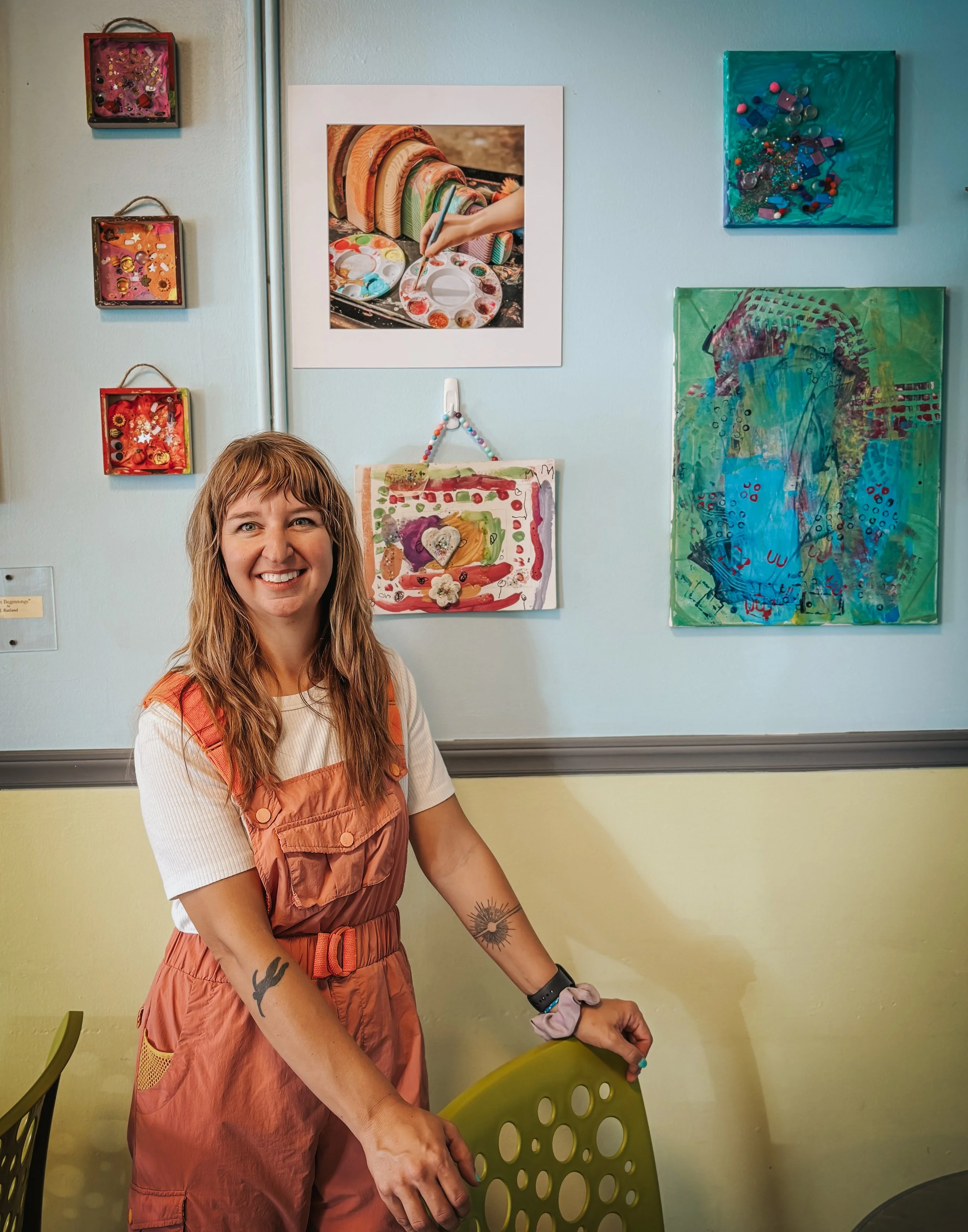 Leah with art from the Light + Love Art Show at The Hop Ice Cream Shop in West Asheville.